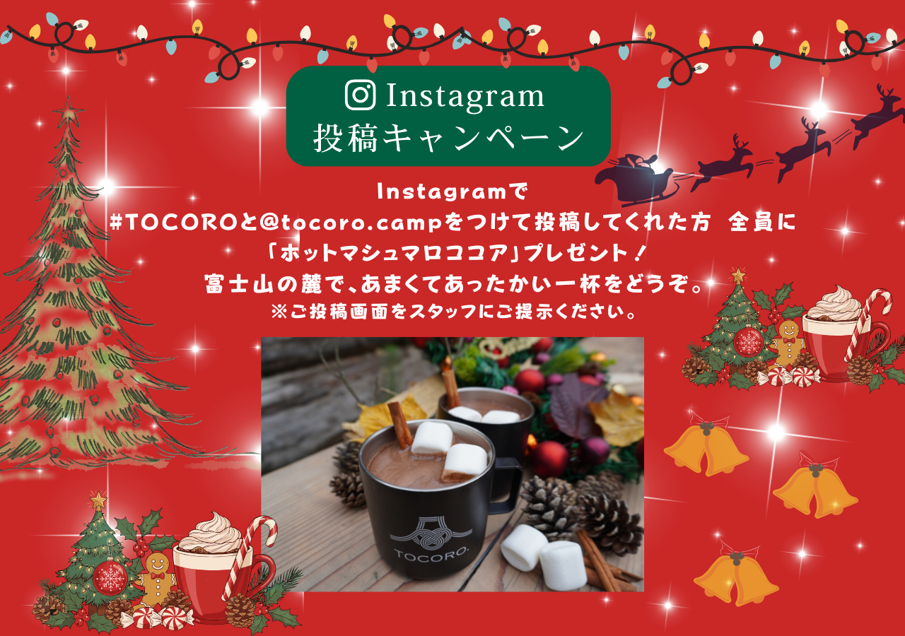 11/15~12/25期間に、ハッシュタグ「#TOCORO」とメンション「@tocoro.camp」を付けて投稿すると『ホットマシュマロココア』をプレゼント💕🥰